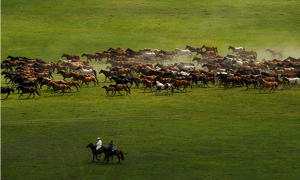 將心融化在大草原上哦 風(fēng)吹草地見(jiàn)牛羊是真的 還看到兵哥哥兩個(gè)人 騎著馬 揮舞著旗 馴一群馬 那場(chǎng)面 帥爆了