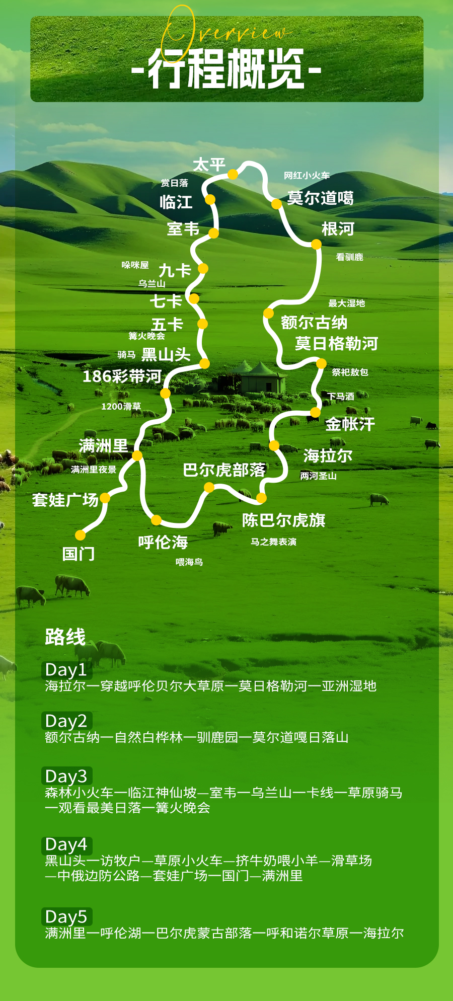 ①此路線是到呼倫貝爾當(dāng)?shù)丶兺鎸嵲谔鞌?shù),而不是像其他家集合日和返程日算兩天行程,例如:其它家集合日1天+游玩3天+返程1天=5日游;本公司當(dāng)?shù)?日游(集合日1天+游玩5天=6日游)
