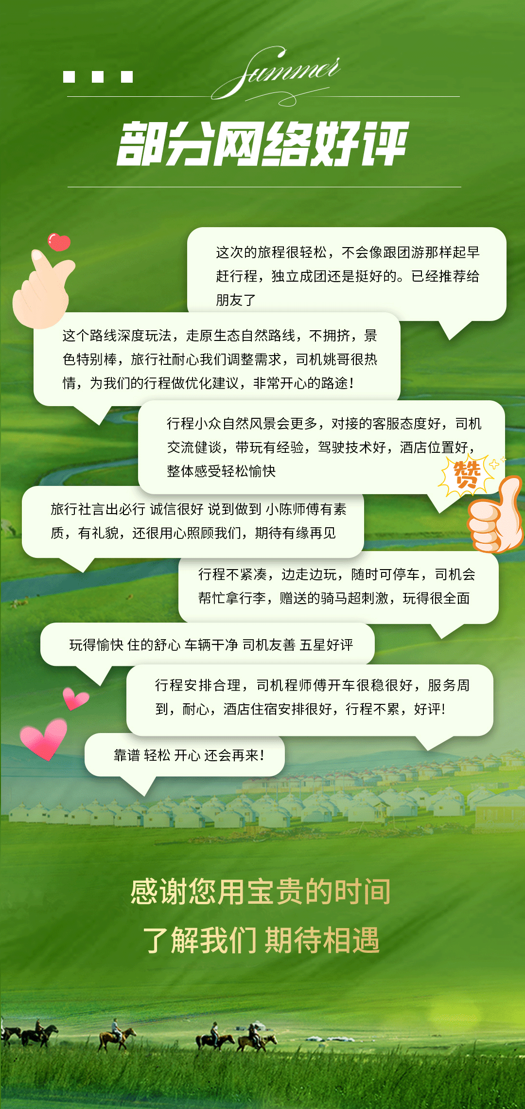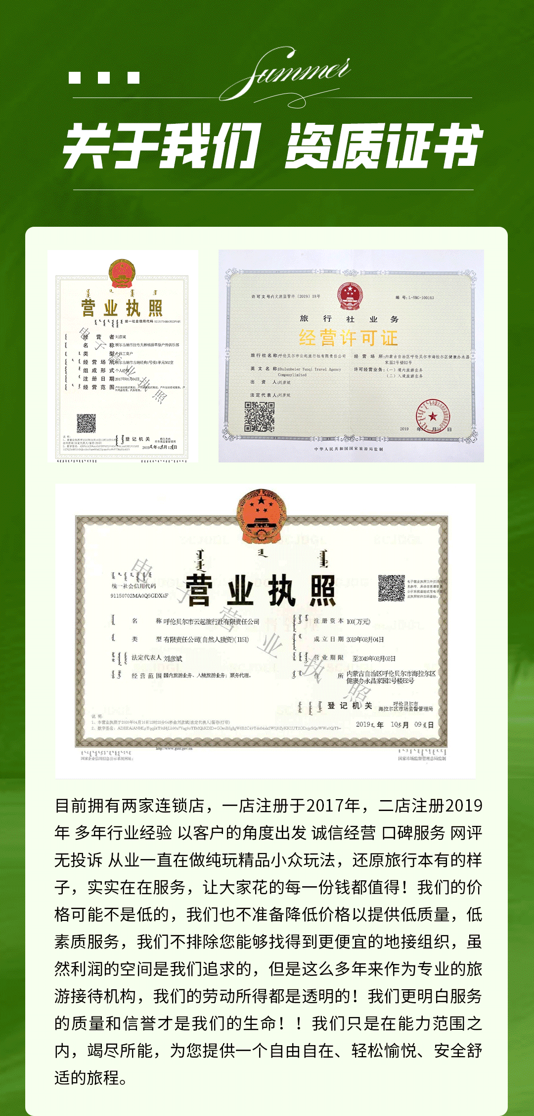 3.眾多好評(píng)口碑宣傳,我們專(zhuān)注戶(hù)外純玩原生態(tài)體驗(yàn)式旅行、行程為八字環(huán)線不走回頭路避免重復(fù)路程,會(huì)讓您的呼倫貝爾之旅不虛此行