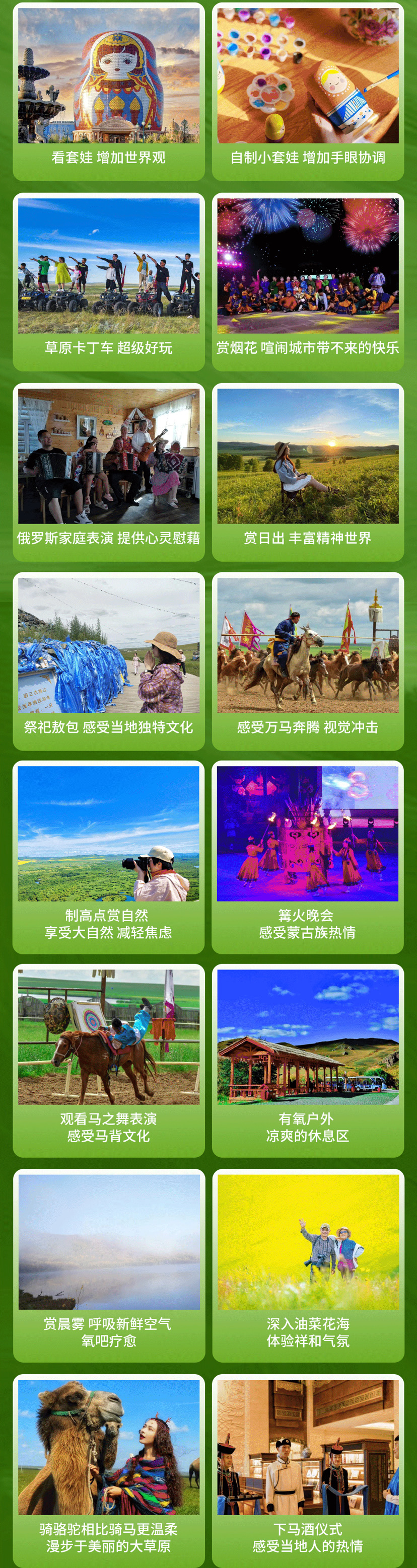 7.贈(zèng)送娛樂(lè)項(xiàng)目:穿蒙古服飾拍照、擠牛奶、喂小羊、草原托馬斯、品嘗蒙古小吃、祭祀敖包、蒙古小課堂、蒙古燒燙氈畫(huà)、網(wǎng)紅天梯打卡、篝火晚會(huì)、民族樂(lè)器展示、夜游滿(mǎn)洲里、旅行社責(zé)任險(xiǎn)、人身意外險(xiǎn)(雙重保險(xiǎn)為我們的旅行保駕護(hù)航)