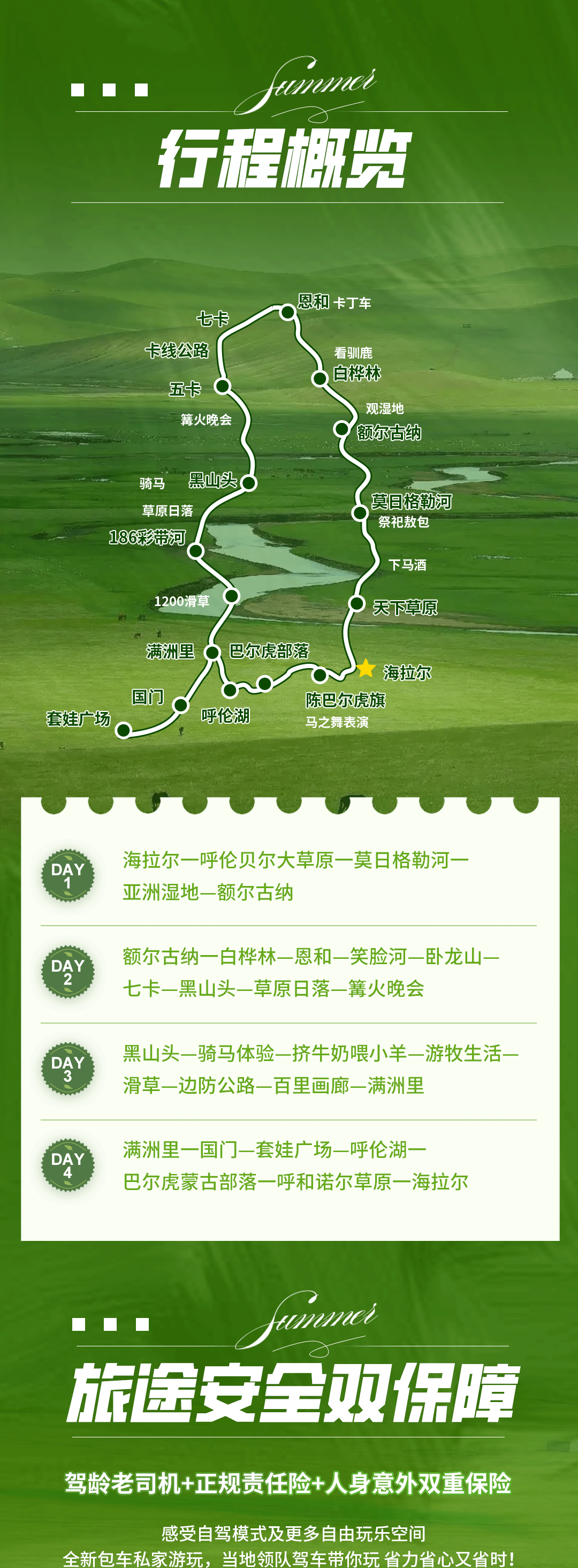 特別注明:本線路為呼倫貝爾云起旅行社獨(dú)創(chuàng)路線,本線路為濃縮型,4天路線看的是5天風(fēng)景,所包含的景區(qū)與游玩的項(xiàng)目同比其他家要多出很多?。。。?/span>